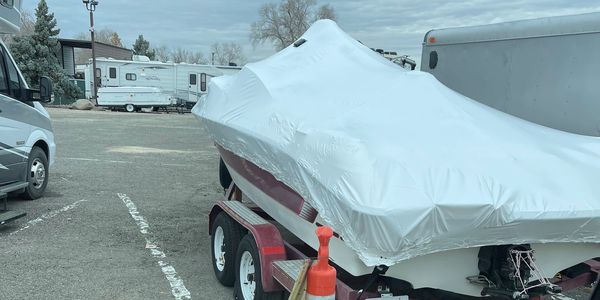 For boats stored outdoors in snowy areas, optional snow frames built with 2×4s provide added support, or we use strapping over a single post with an end cap at the boat's center. Our shrink wrapping ensures your boat stays safe and in top condition for winter storage.